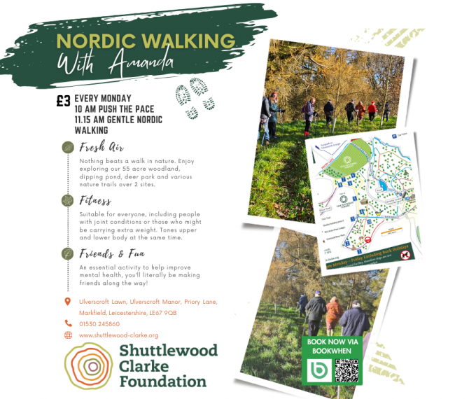 Join us for a revitalising Nordic Walking session every Monday at Ulverscroft Manor, designed to suit different fitness levels: